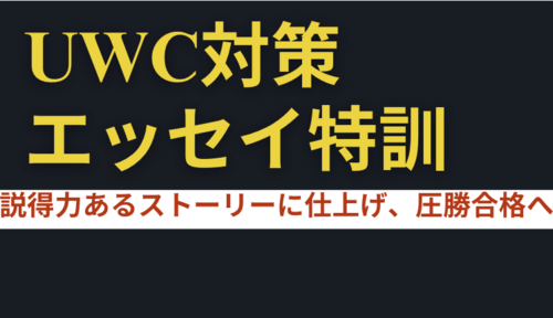 お得なお知らせ:この【UWCエッセイ特訓】は「UWC合格マスターパッケージ」に含まれています! パッケージなら20%お得!皆さん「UWC合格マスターパッケージ」を選んでいます! 「UWC合格マスターパッケージ」の詳細はこちらをチェ・・・